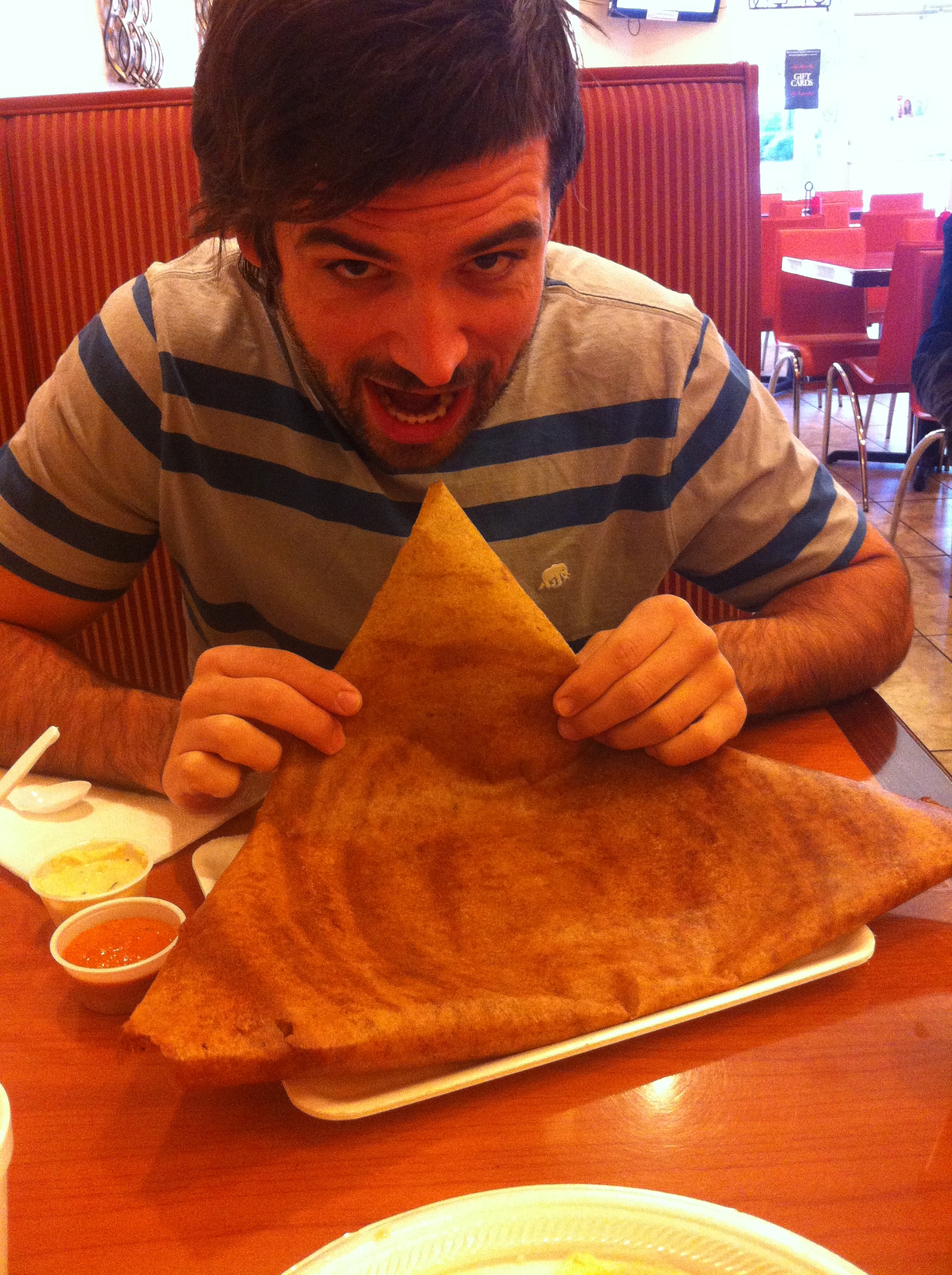 We went to Hot Breads, a favorite Indian joint, for dosas and iddli. So you get another picture of Logan jamming food in his face in a humorous fashion.