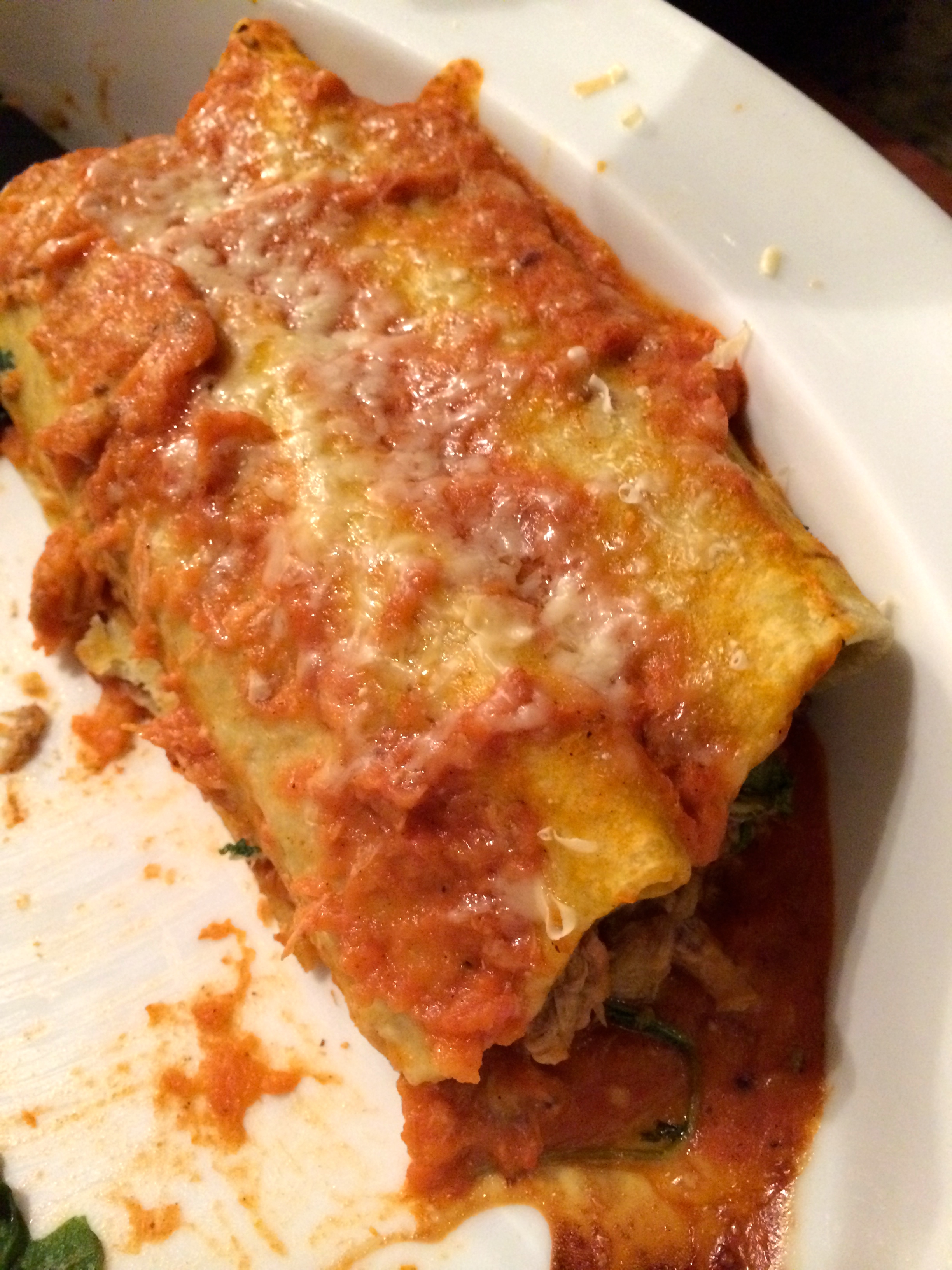 I made the enchilada sauce following this recipe, because we had everything on hand (here’s to Rotel!) and it seemed super easy. It was that, as well as being really tasty and full of flavor. I topped the whole thing with about an ounce of shredded cheddar cheese.