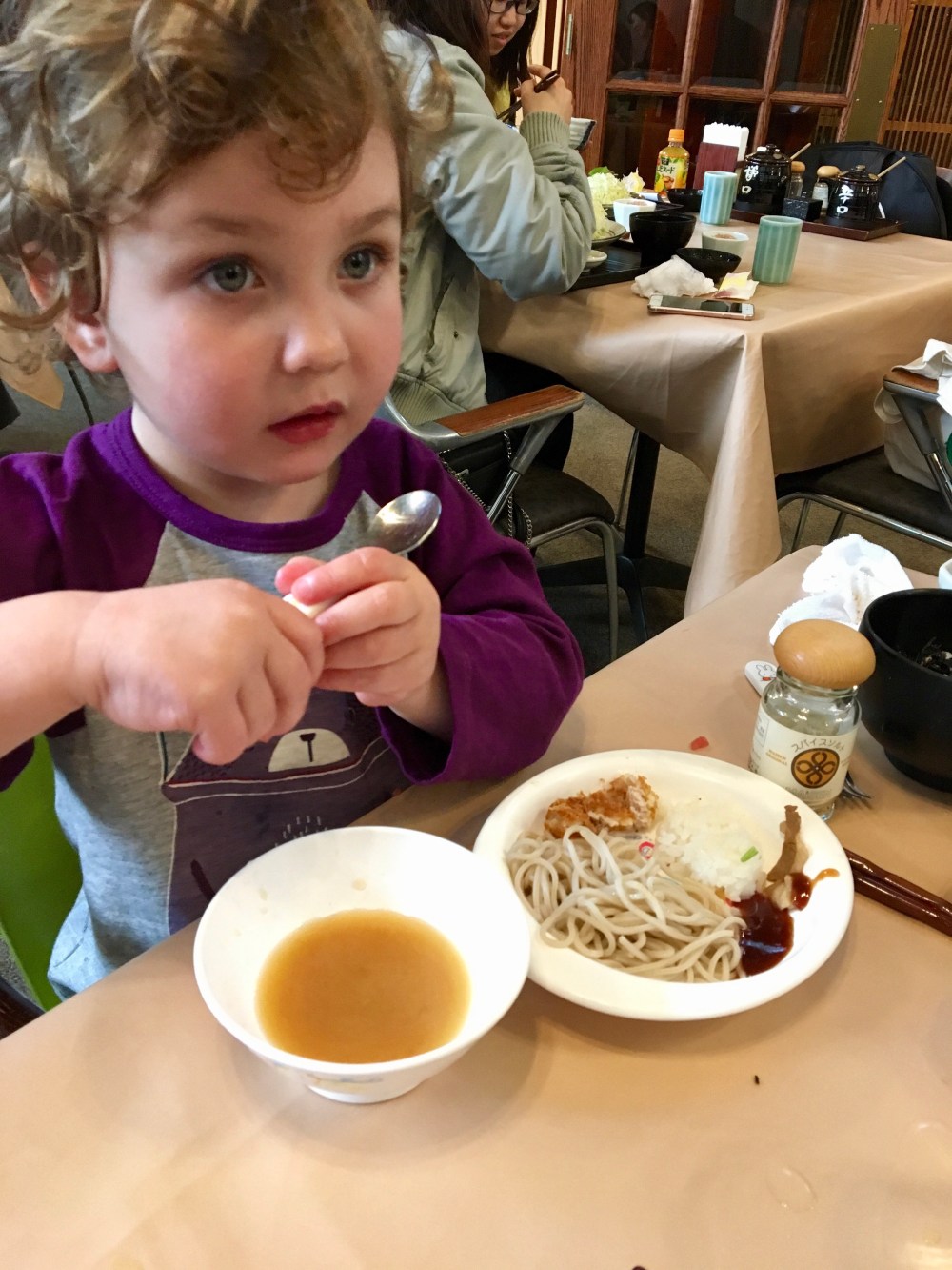 Ami’s favorite was the miso soup, with the rice being a close second. She got awfully excited about the array of condiments, and salted her soup and my cabbage and her rice and Logan’s noodles and and and…