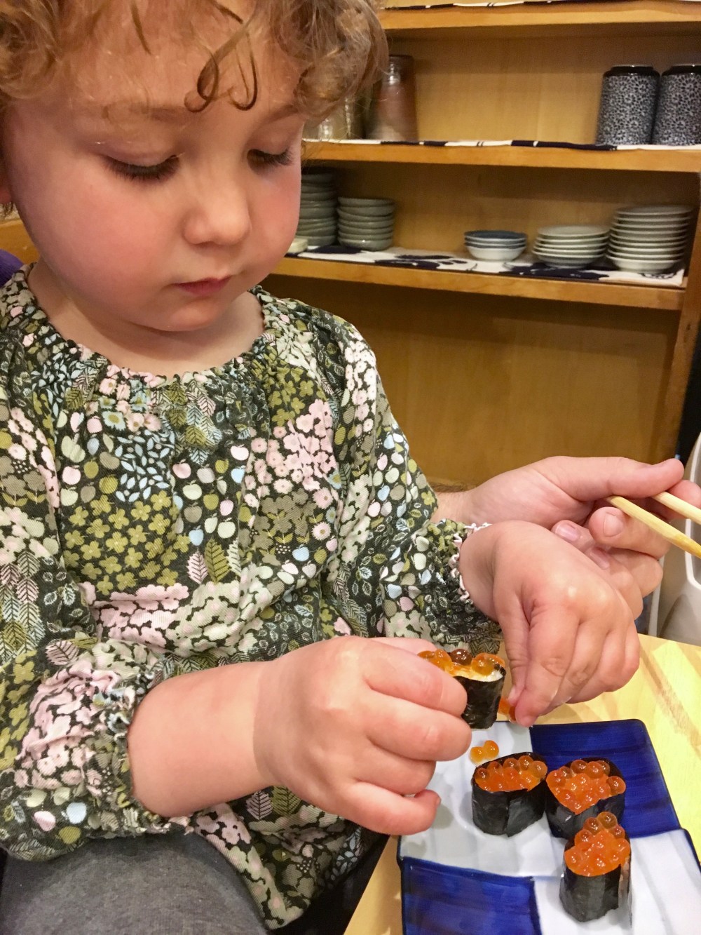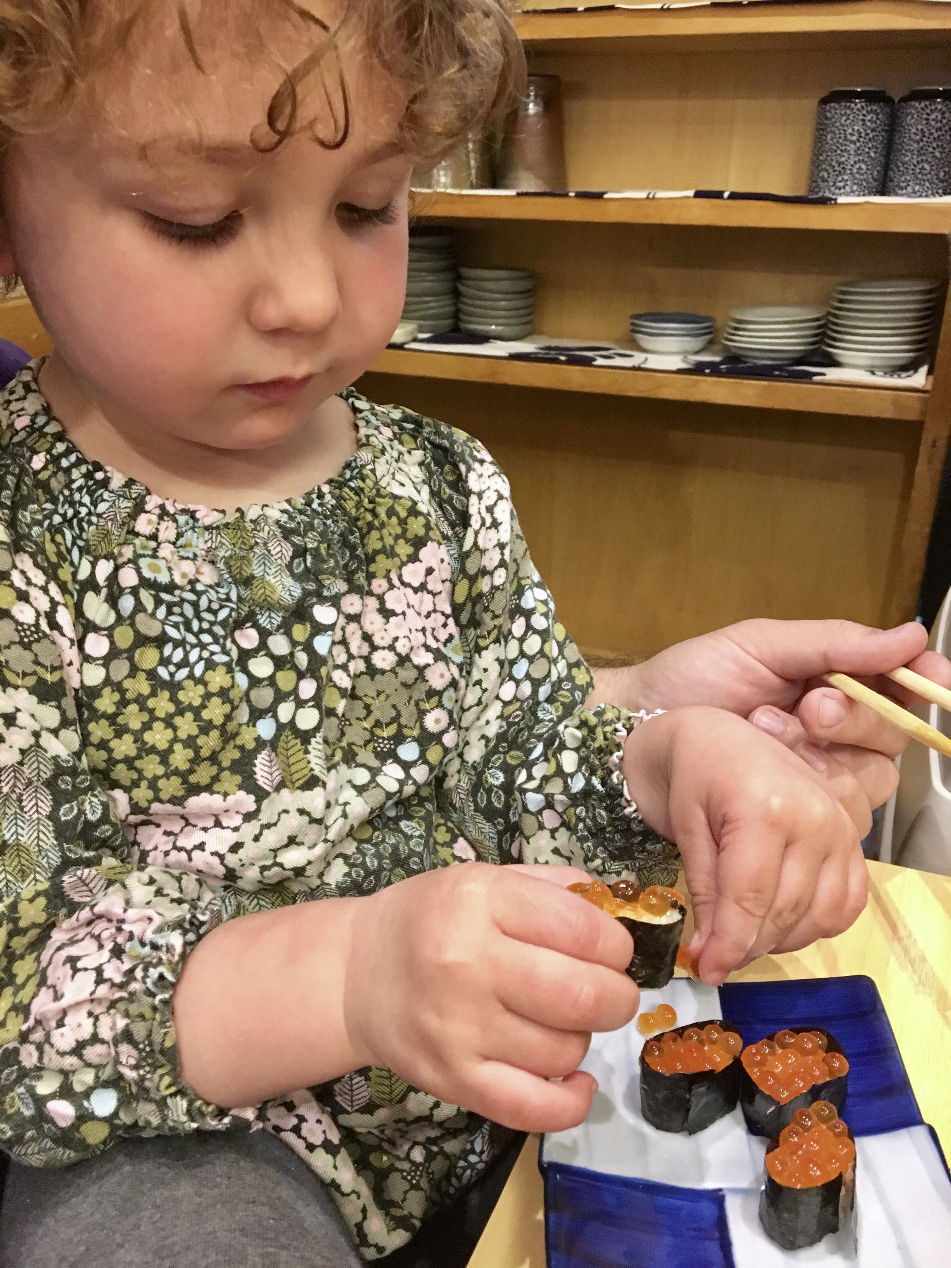 When Ami showed interest in the salmon roe we’d been served, we ordered her a piece. The sushi chef split one order into little bite-sized pieces for her.