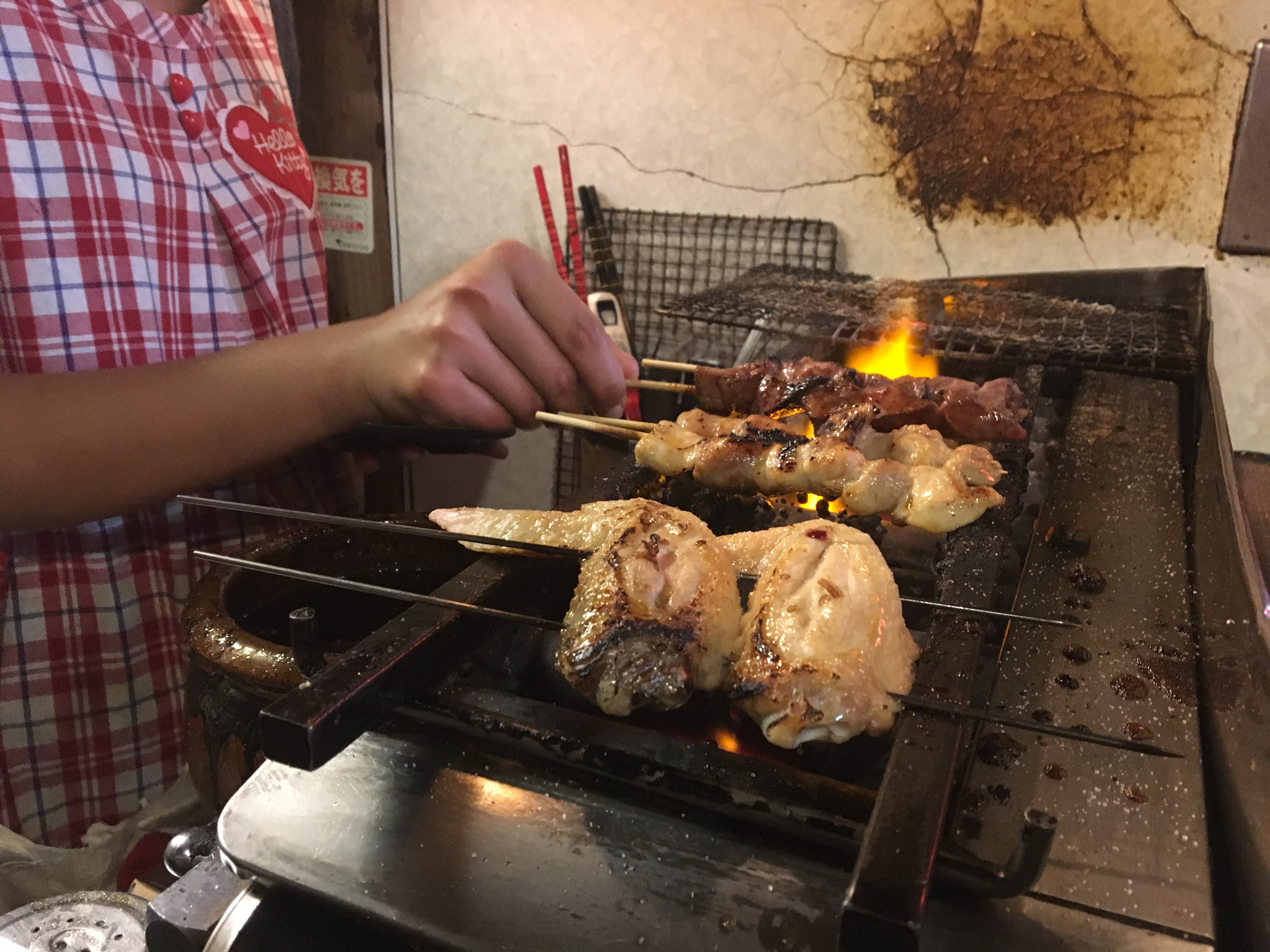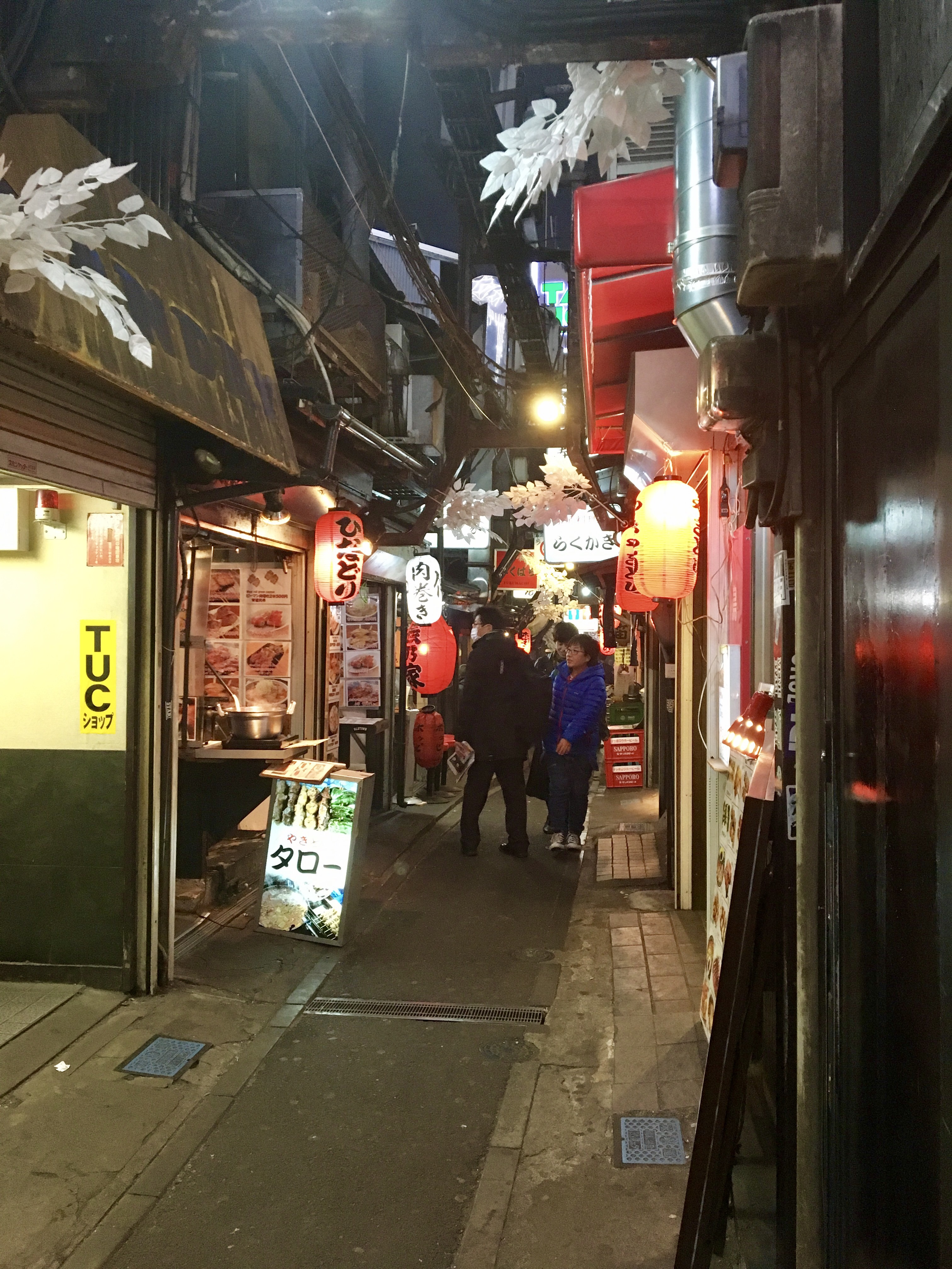Our secondary destination was the evocatively named Piss Alley, which is also called Memory Lane. It smelled not at all of pee, not to worry. Instead, it’s a narrow lane of yakitori joints, restaurants that serve grilled meats and vegetables cooked on skewers over charcoal.