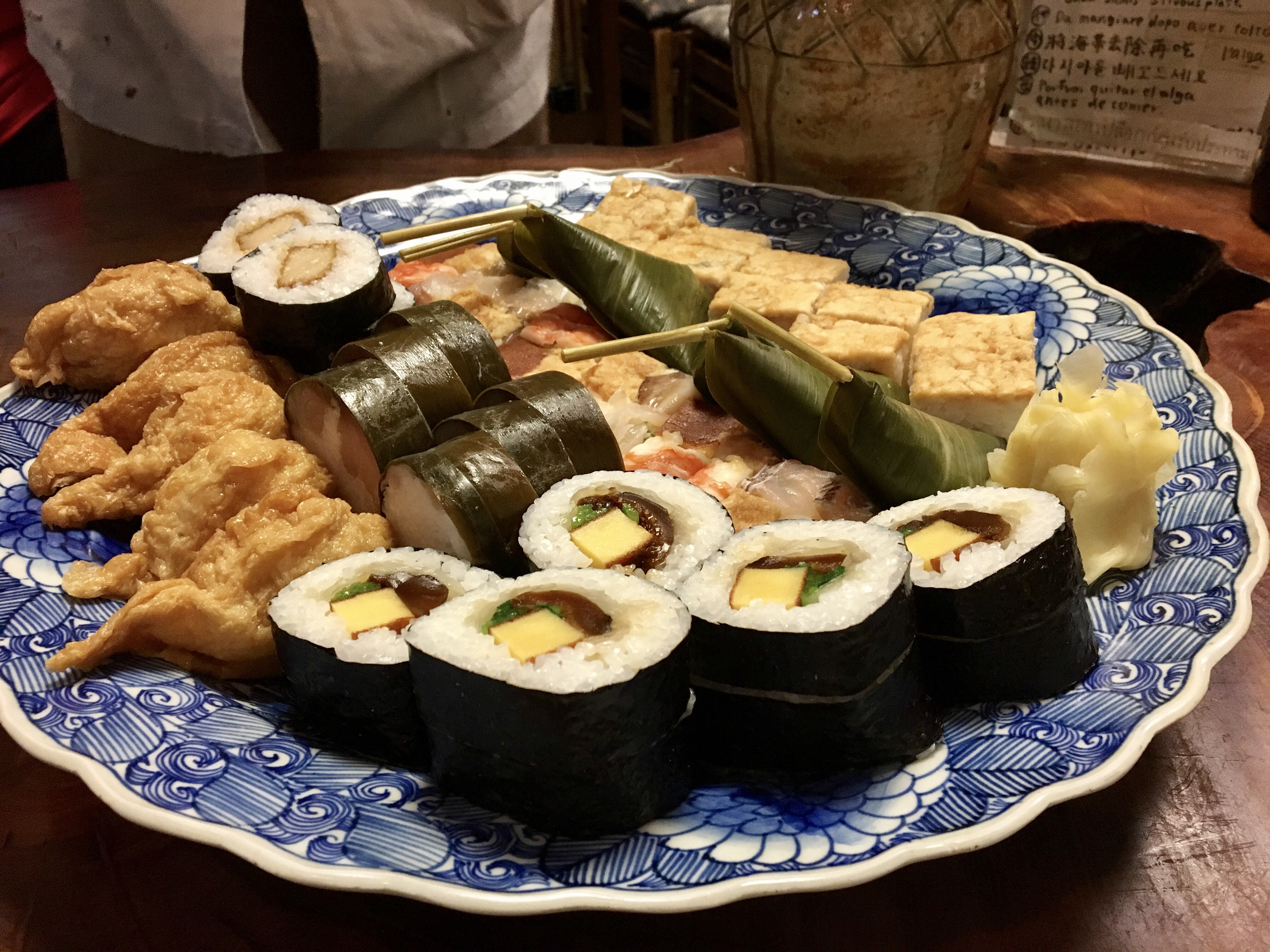 Their particular specialties include the round pieces standing on their sides, which are made of mackerel wrapped in kelp (which is meant to be peeled off prior to eating) and the inarizushi, which is made of rice mixed with hemp seed, burdock, and yuzu rolled in a pouch made of skimmed tofu. The pieces in the back are worthy of note, too, made from gluten that’s been fried and stewed in soy sauce, and then rolled into the middle of a maki roll with rice and seaweed. Interesting stuff, and very different from what we usually think of as sushi.