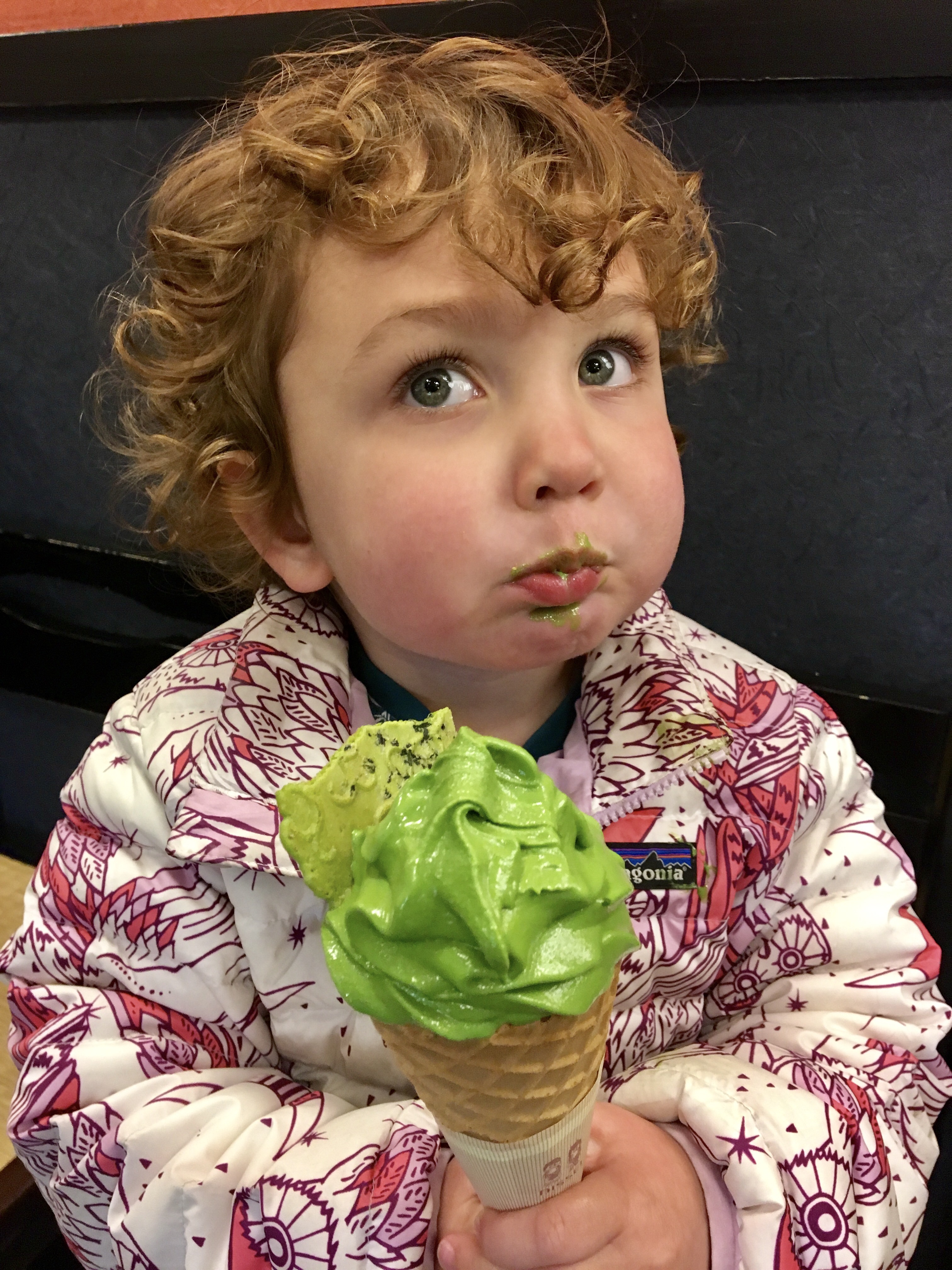 After dinner, we passed by a smal shop that sold wafers and soft serve ice cream flavored with matcha (green tea made from ground tea leaves). We got Ami a cone. The color was so striking!
