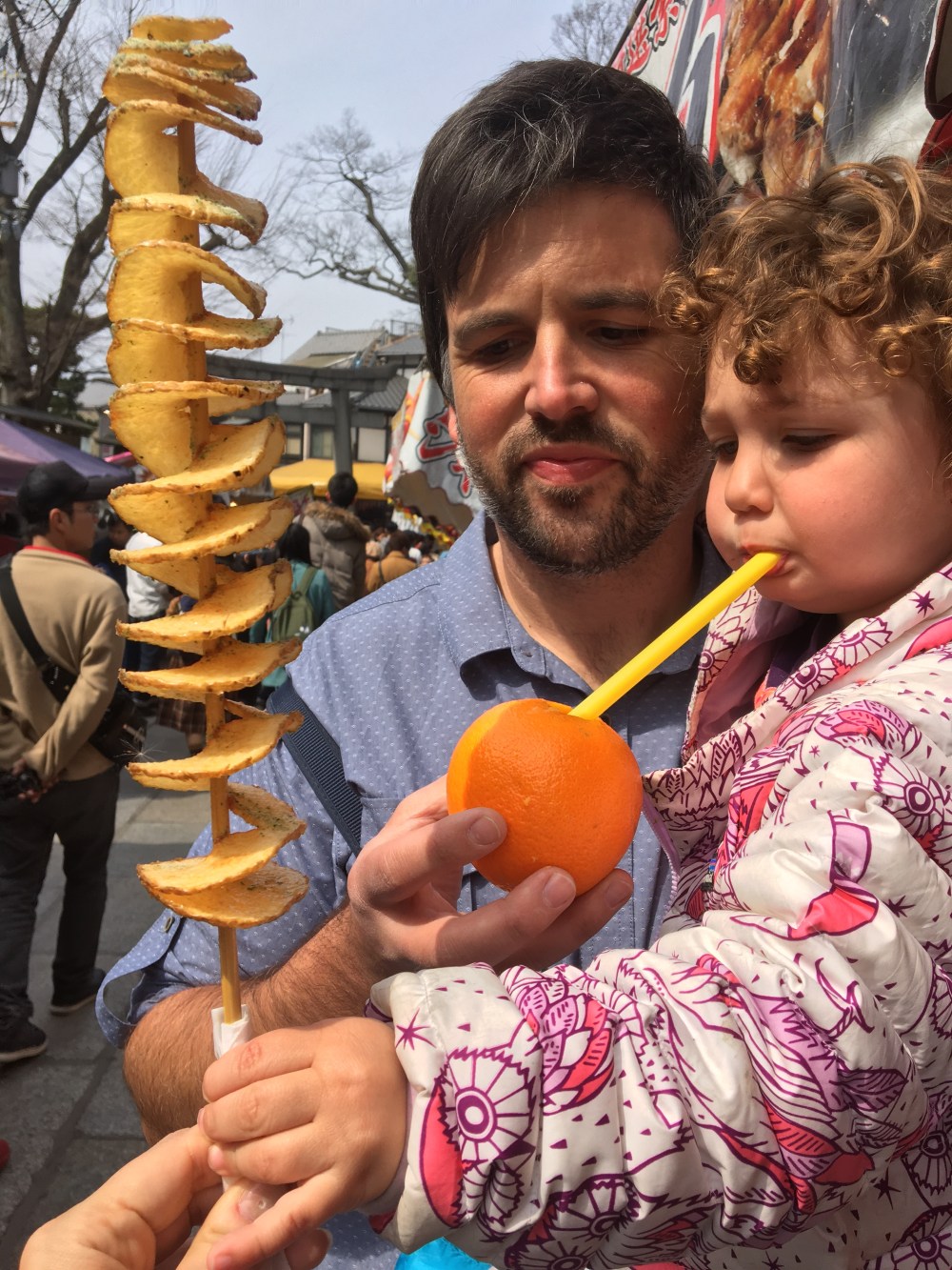 In an unexpected twist, the road at the bottom of the shrine was lined in street-food stalls, all of which were doing a brisk business. We decided to graze for lunch. Spiralized potatoes, orange juice, pancakes shaped like fish and filled with red bean paste…