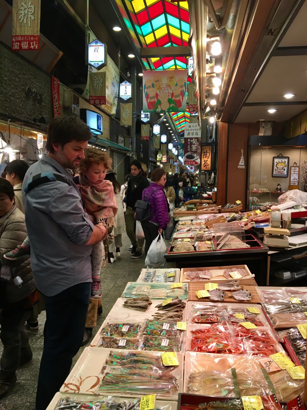 Nishiki Market, a narrow, covered street full of food stalls, was crowded and fascinating. We admired pickles and spice blends and prepared foods.