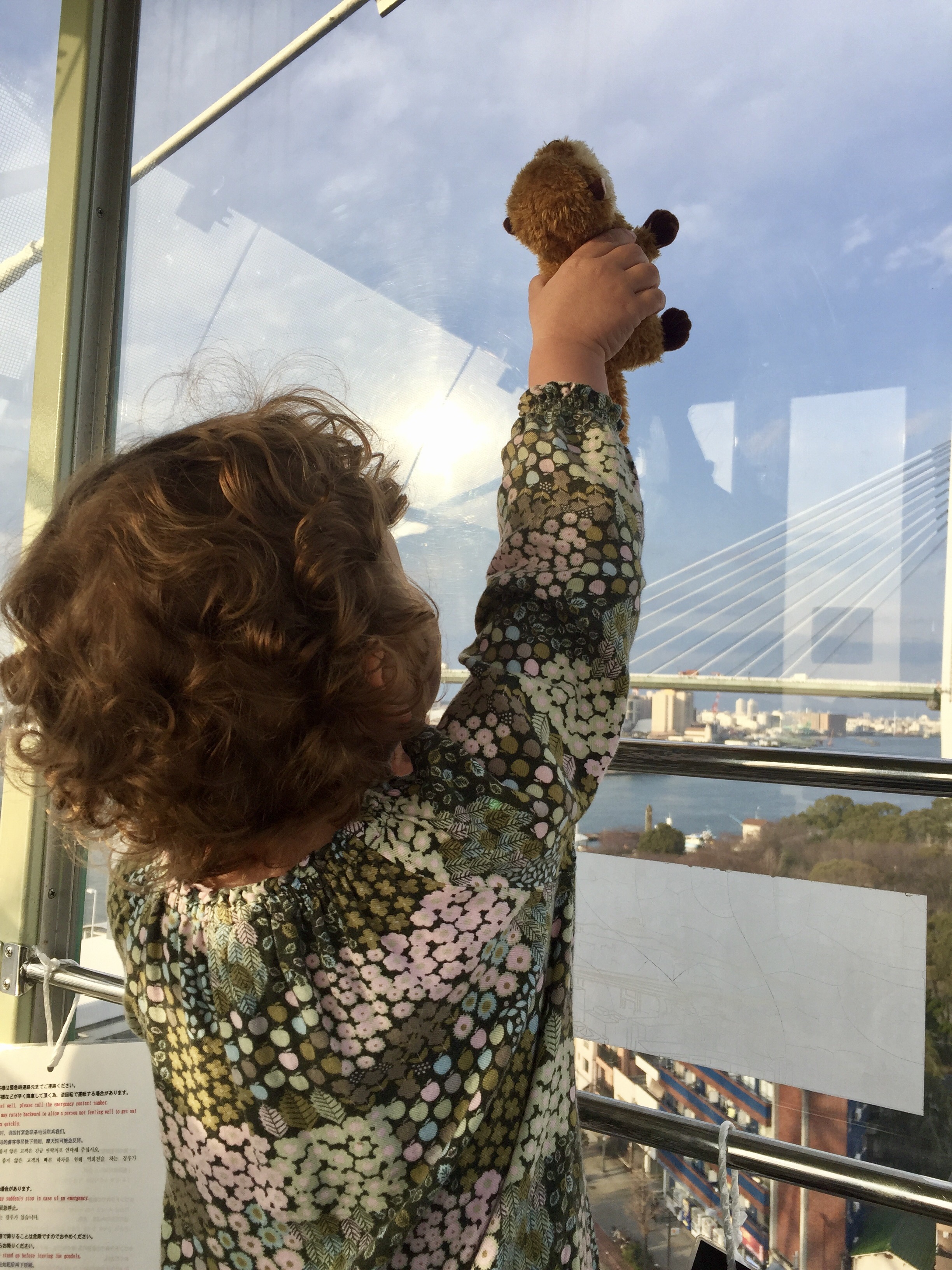 And here is Ami teaching her new stuffed river otter proper etiquette for getting in and out of the Ferris wheel cabins