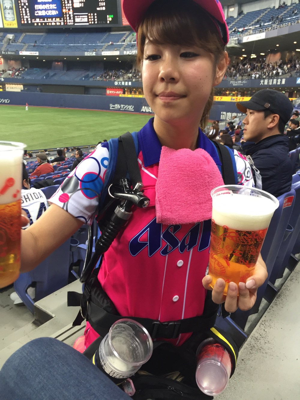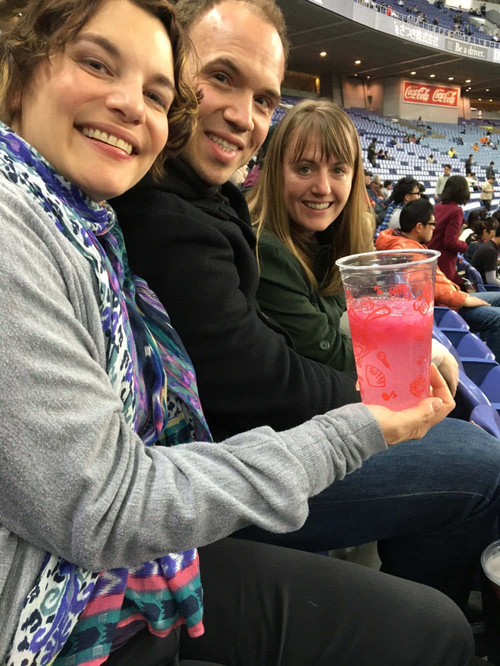 Also, we got to eat neat Japanese baseball snacks, including grilled beef tongue and chicken fries, and we ordered beer from young women with kegs strapped to their backs.