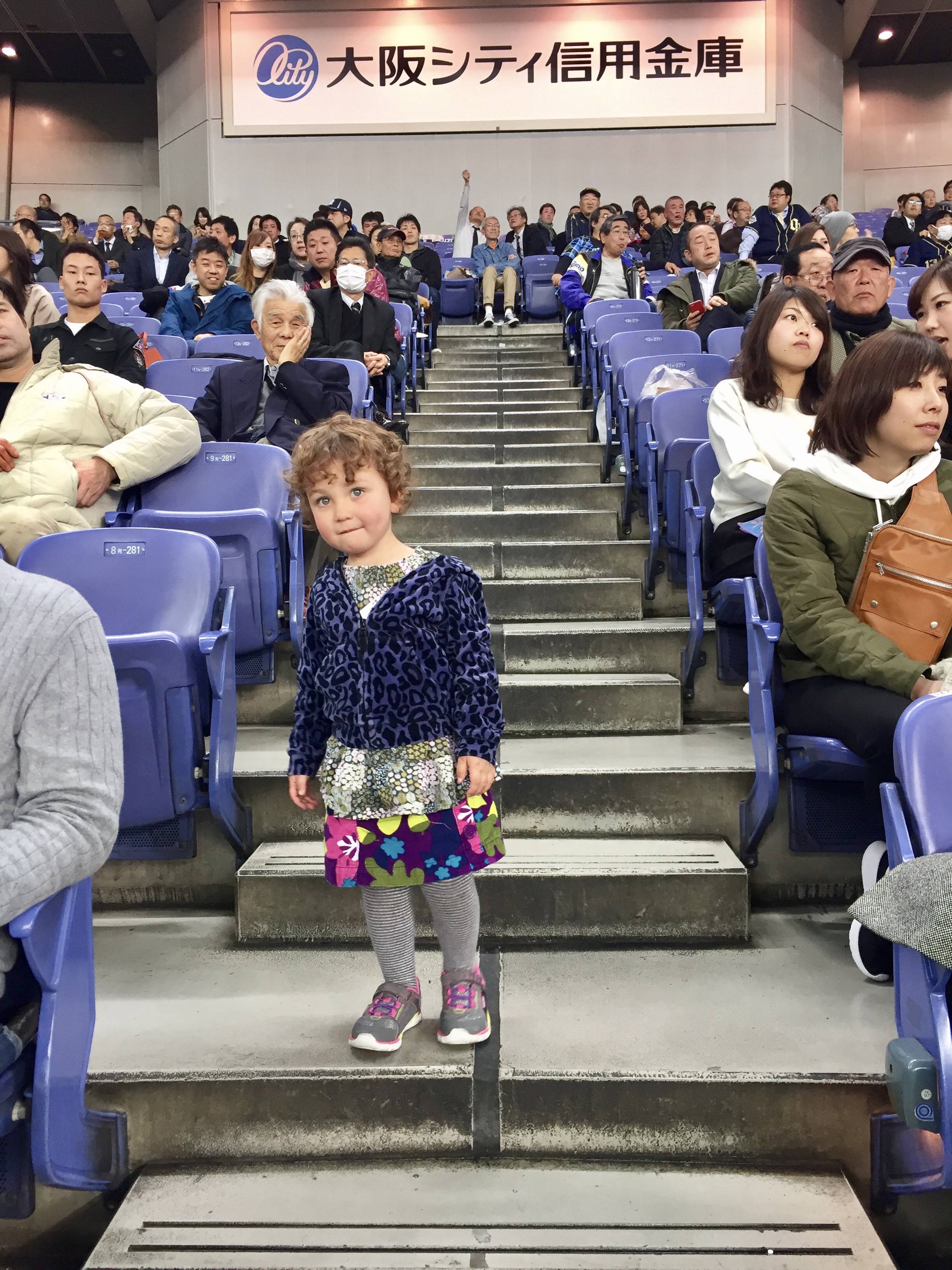 I was so excited to get to see a baseball game in Japan! They take baseball very seriously here. There ar drum and horn corps for the home and away teams! Today, the Buffaloes were playing the Hiroshima Carp. The game was pretty sparsely attended, which was honestly fine with a toddler. Ami really got into cheering and clapping and asked me a lot of questions about the rules of baseball. (“Why people clap? Why man hit ball?”)