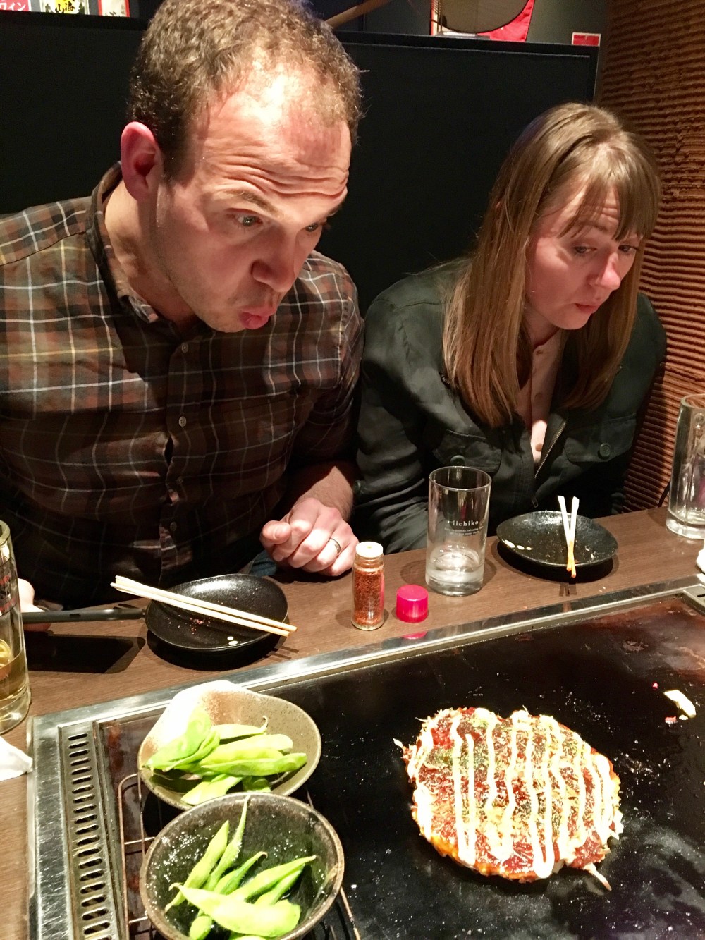 We left in the top of the 6th, because even though the game was being played with incredible efficiency, it was getting a bit late for the toddler. Thus, off in search of okonomiyaki, Osaka’s famed savory pancake! Found good ones, too.