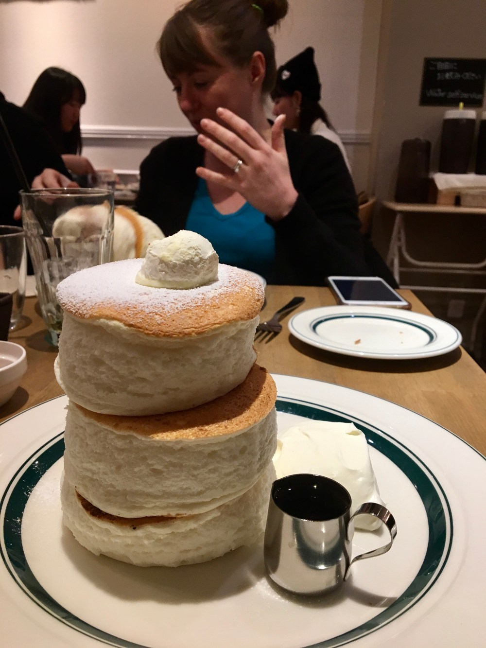 The morning started with a search for big, fluffy Japanese pancakes (after a search for coin lockers at Namba Station where we cold stash all of our luggage). Logan and Tori were particularly excited about these, and we were having a lot of trouble finding them! The first place had an hour wait, the second was totally out of the fancy premium pancakes, but the third…