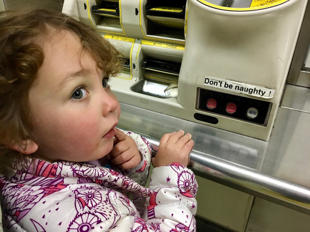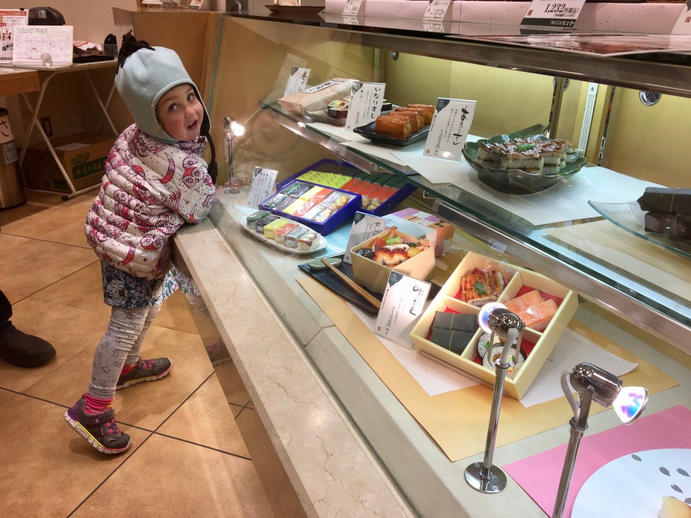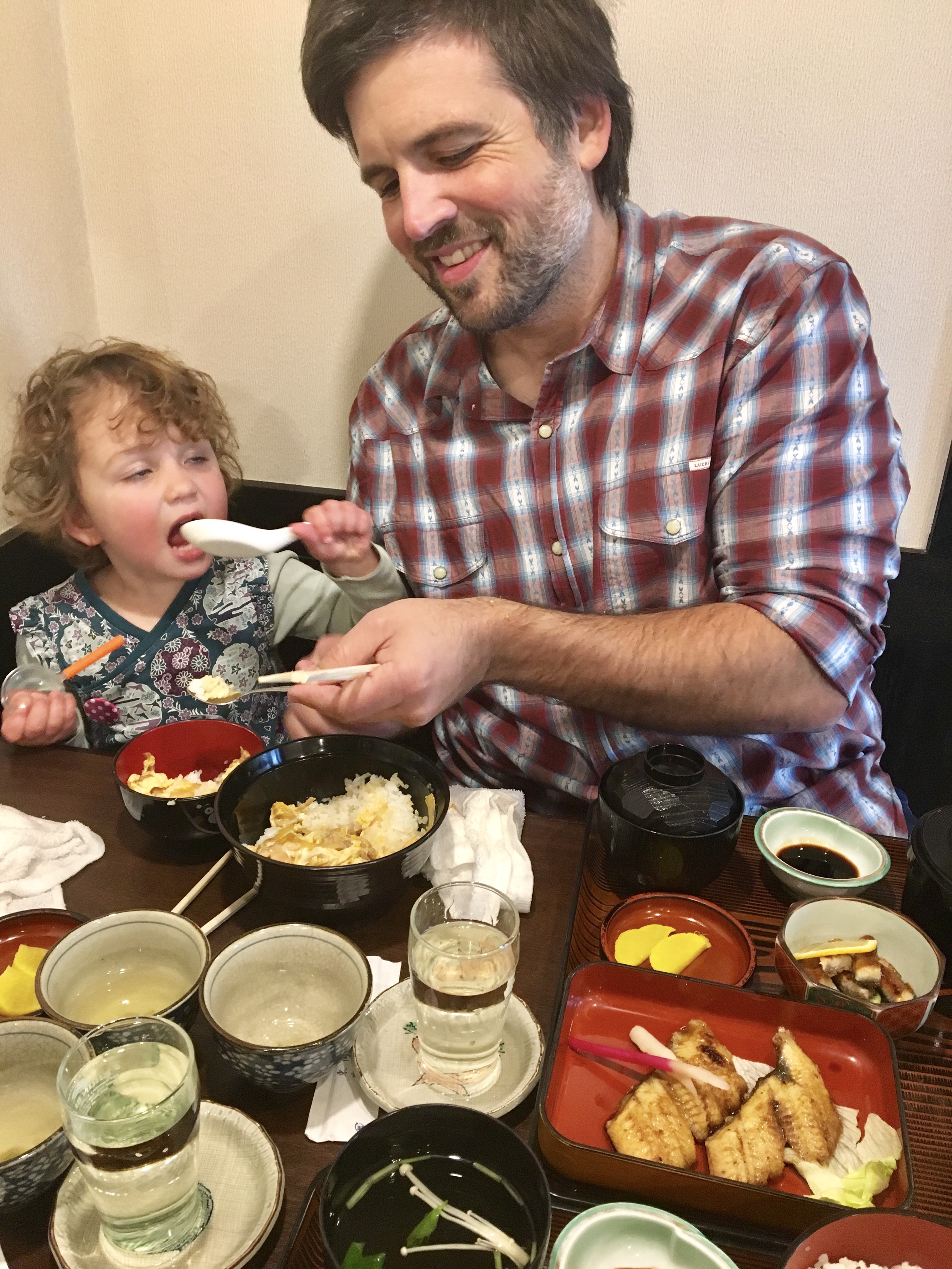 For dinner, Logan and I got two dinner sets that came with a lovely array of foods. We each chose eel, and mine had spinach with sesame sauce, pickles, sashimi, rice, and clear soup. Logan’s had a hotpot, pickled vegetables, a vinegary dish with more eel, seaweed, and cucumbers, rice, and clear soup. We ordered Ami an oyakodon, an egg and chicken dish served on rice. She DEMOLISHED it. Hungry girl! I think I can see her outgrowing her 3T clothing on this trip, which is surprising.