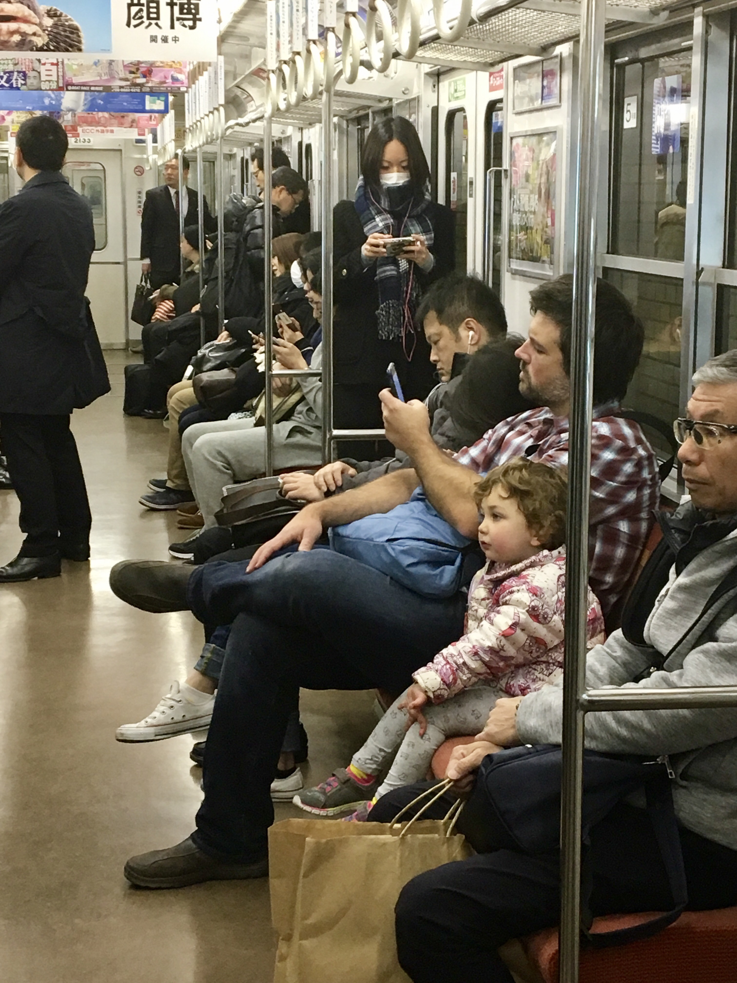 From there, we boarded the Kintetsu line for he 40-minute ride to Nara. This wasn’t on one of the super high-speed shinkansen lines, just basically a regular subway train, but the ride was comfortable and smooth. So smooth, in fact, that Ami fell asleep leaning up against her dada.