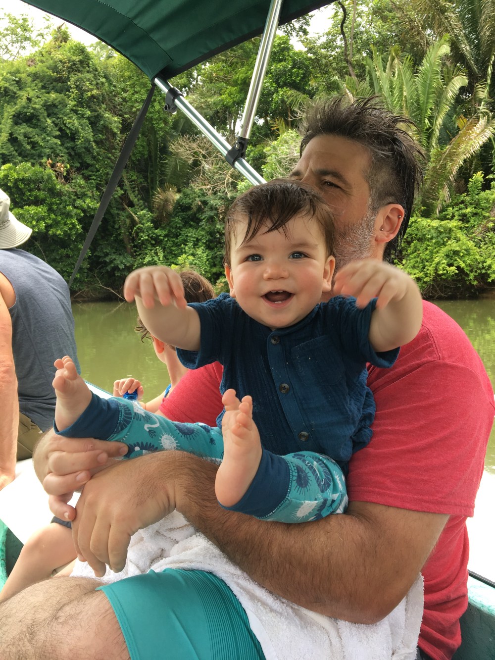 Then, back in the boat! Percy sped away trying to lose the mosquitoes that had decided to come along with us. Around a turn in the river, he offered the opportunity to swim. Logan and Ami took him up on it, of course.